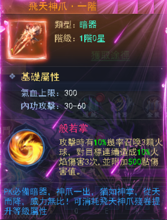 每一個飛天神爪內部地結構都非常複雜,由大量的齒輪和彈策組成,看上去和袖箭有些棗紙相似,但要比袖箭更大一些,也更加厚實,內側有絨布襯底,效用無窮。遊戲中飛天伸爪能彈射出秘制火彈,無視防禦